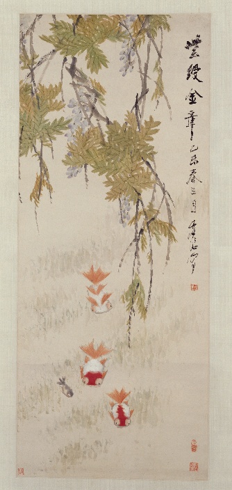 紫藤金鱼图扇面