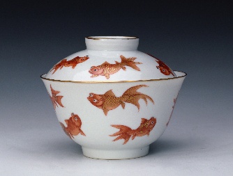 白釉矾红彩加金彩金鱼纹盖碗